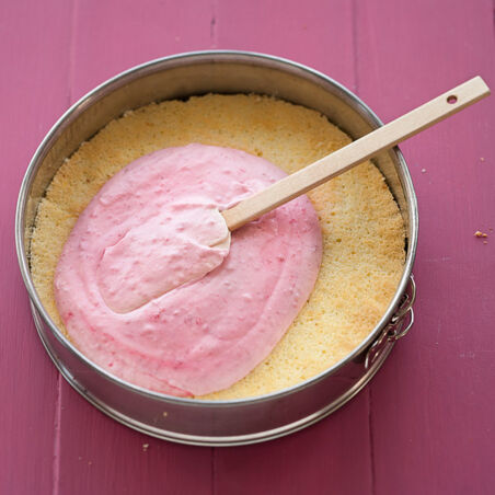 Den Mürbeteigboden in die Springform legen, mit Himbeergelee bestreichen. Den Biskuitboden waagerecht teilen. Eine Hälfte auf den Mürbeteig mit dem Gelee legen, mit der Hälfte der Himbeersahne bestreichen. Mit dem zweiten Boden bedecken, diesen leicht andrücken und mit übriger Himbeersahne bestreichen. Abgedeckt mindestens 4 Std. kalt stellen.