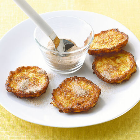 Die Butter in einer Pfanne erhitzen. Die Apfel-Kartoffelmasse in einem Sieb abtropfen lassen, dann mit einer Kelle vier Portionen in die Pfanne geben, leicht flach drücken und von beiden Seiten bei mittlerer Hitze goldgelb braten. Zum Schluss die Puffer mit Zimt und Zucker bestreuen.