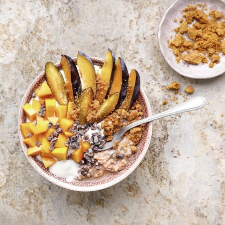 Diese vegane Frühtsücksbowl ist perfekt für den Herbst und Winter. Neben Zwetschgen wird sie nämlich mit Kakis getoppt. Weihnachtlich wird es durch Spekulatiusgewürz und Karamellgebäck (Lotus).