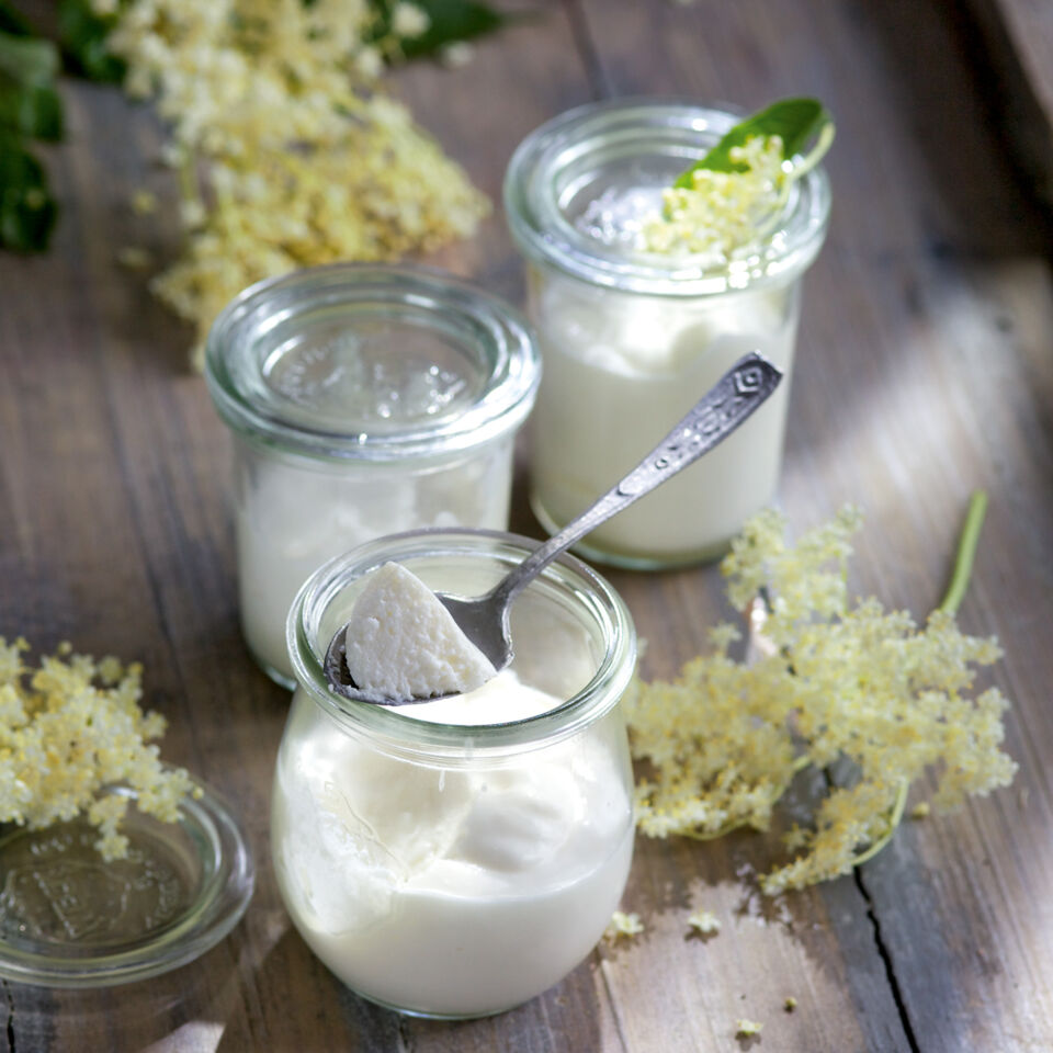 Die Sahne mit den Schneebesen des Handrührgeräts steif schlagen und unterheben. Die Holunderblütenmousse auf Gläser verteilen und mindestens 3 Std. kühl stellen.