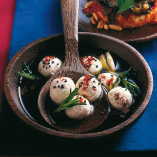 Kurz vor dem Servieren die Minze abspülen, trockenschütteln und die Blättchen abzupfen. Paprikaviertel vorsichtig wenden und mit den Minzeblättchen bestreuen.