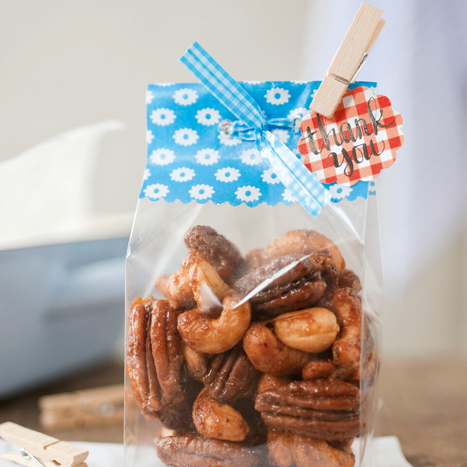 Die Nüsse auf dem Backblech verteilen und im Ofen (Mitte) etwa 15 Minuten rösten, dabei einmal zur Halbzeit durchmischen. Aus dem Ofen nehmen und auskühlen lassen. In luftdicht verschließbare Behälter abfüllen, bis zum Verschenken darin aufbewahren.
