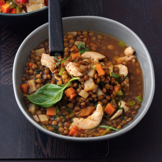In einem Topf 1 EL Öl erhitzen, die Möhren, die Schalotten, den Knoblauch und Chili darin unter Rühren bei mittlerer Hitze andünsten. Die Linsen in einem Sieb waschen und dazugeben. Mit der Brühe aufgießen und zugedeckt bei schwacher Hitze in 35-45 Min. weich garen, aber nicht zerfallen lassen.