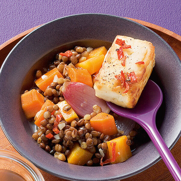 Der Linseneintopf bekommt durch Apfelessig und Honig einen fruchtig-süßen Geschmack, zu dem der gebratene Feta einen wunderbaren Kontrast bildet.