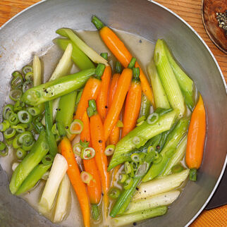 Möhren putzen, schälen, längs halbieren und die Hälften schräg in große Stücke schneiden. Rapsöl in einem Topf erhitzen, Möhren und 3 EL Wasser dazugeben und zugedeckt bei mittlerer Hitze ca. 10 Min. dünsten. Die Möhren mit Salz und Muskat würzen.