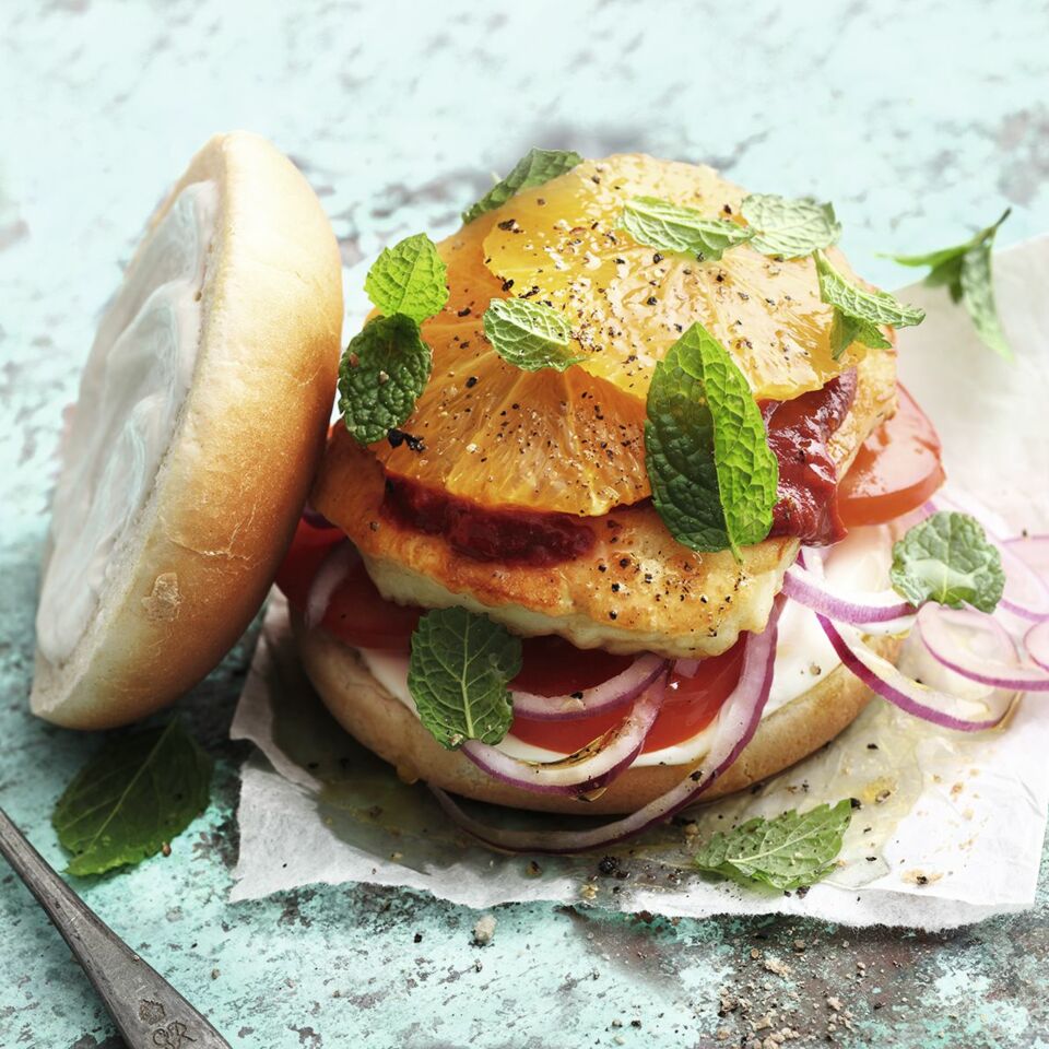 Mit diesem vegetarischen Halloumi-Burger wird es heiß. Die würzige Harissapaste bekommt einen fruchtigen Gegenspieler dank Orangenscheiben.