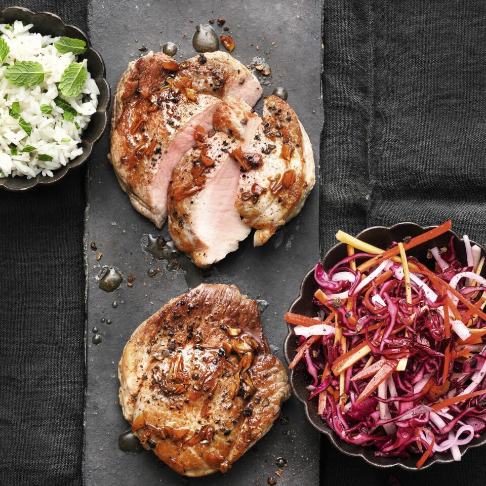 Den Rotkohl unter den Salat heben und diesen in vier Schälchen verteilen. Die Steaks in je 6 Streifen schneiden und mit der Sauce auf vier Tellern anrichten. Mit dem Salat servieren. Dazu passt Reis.