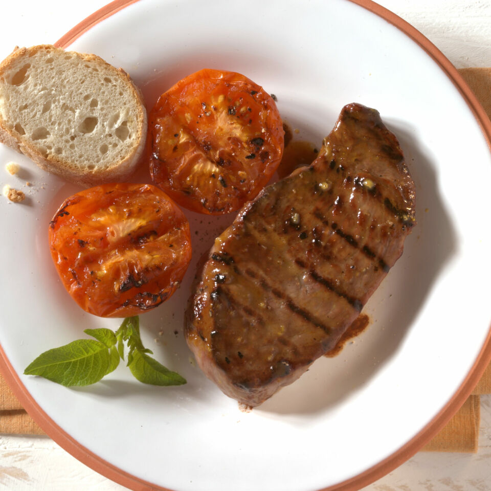 Den Grillrost heiß werden lassen, ölen und die Steaks bei starker Hitze auf dem Rost pro Seite 3 (rosig) bis 5 Min. (durch) grillen. Tomaten am Rand auf den Schnittflächen rösten. Steaks bei schwacher Hitze hoch über der Glut 5 Min. ziehen lassen, salzen und pfeffern, mit Tomaten servieren.