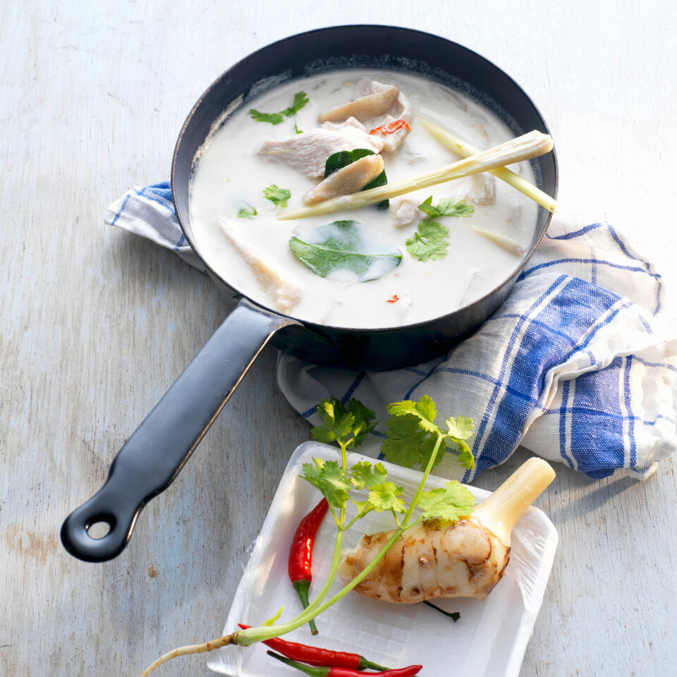 Du musst die Suppe auslöffeln? Bei dieser kokosmilden Hühnersuppe mit Kaffirlimetten-Aroma und einer leichten, eher unterschwelligen Schärfe ein Vergnügen!