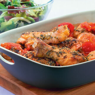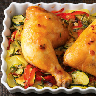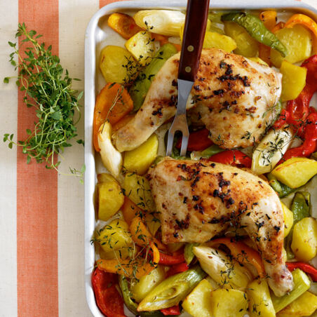 Hühnerkeulen auf Paprika-Lauch-Kartoffeln