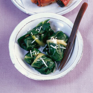 Mangoldblätter waschen und dickere Blattrippen flacher schneiden. In kochendem Salzwasser 1-2 Min. blanchieren, bis sie biegsam sind. In ein Sieb abgießen, abschrecken und abtropfen lassen.