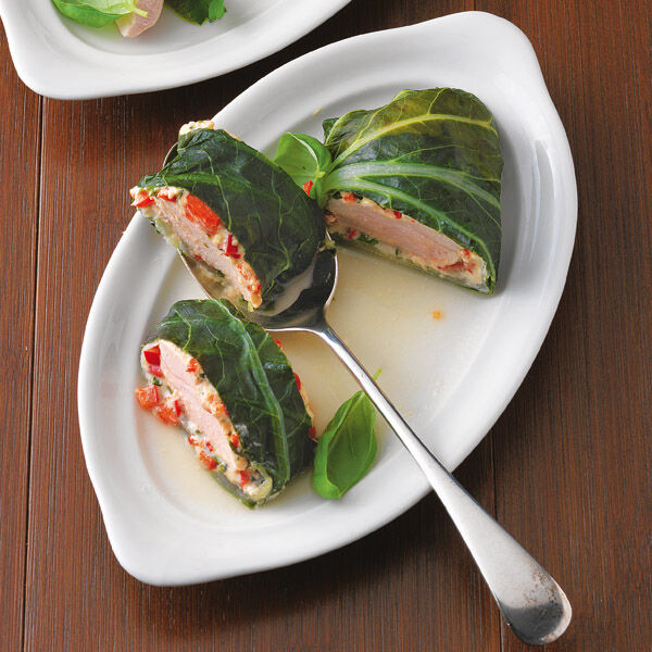 Die Hähnchenbrustfilets kalt abspülen, trocken tupfen, salzen und pfeffern und rundherum mit der Käsecreme einstreichen. Jeweils 2 Mangoldblätter leicht überlappend aufeinanderlegen und je 1 Hähnchenbrustfilet darin einwickeln. Nebeneinander in einen Dämpfeinsatz legen.
