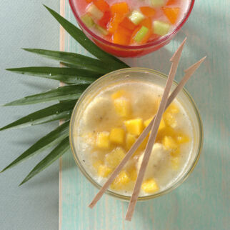 Die Banane schälen und in Stücke schneiden. Orangen und Limette auspressen. Säfte, Banane, Ananasstücke und den Ananassirup mit den Ananaseiswürfeln im Mixer zu einer glatten Masse pürieren. Die Mischung in Pappbecher füllen und abgedeckt im Tiefkühlgerät gefrieren lassen, bis sie halb gefroren, aber noch nicht hart ist. Das Sorbet in den Bechern mit Trinkhalm und Löffel servieren.