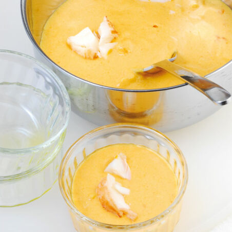 Die Sauce etwas abkühlen lassen, dann die Eigelbe hinzugeben und mit einem Holzlöffel unterrühren. Hummerfleisch kleiner zupfen und unterrühren. Eiweiße mit 1 Prise Salz steif schlagen und unter die Sauce rühren.