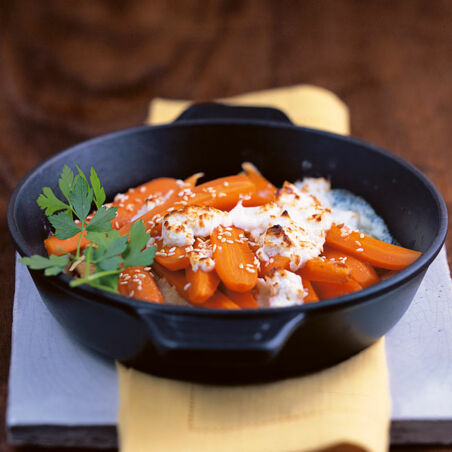 Hummus in eine Auflaufform geben und verstreichen. Die Möhren darauf verteilen. Mit Sojacreme bestreichen. Schafkäse zerbröckeln und darüber geben. Sesam aufstreuen. Den Auflauf im Ofen (Mitte, Umluft 180°) ca. 20 Min. backen. Petersilie waschen, trockenschütteln und den Auflauf damit garnieren.