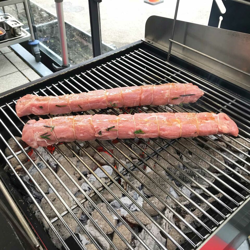 Nun das Fleisch bei mittlerer Hitze und ständigem Wenden auf dem Grill so lange garen, bis der Kalbsrücken eine Kerntemperatur von 54 °C hat.