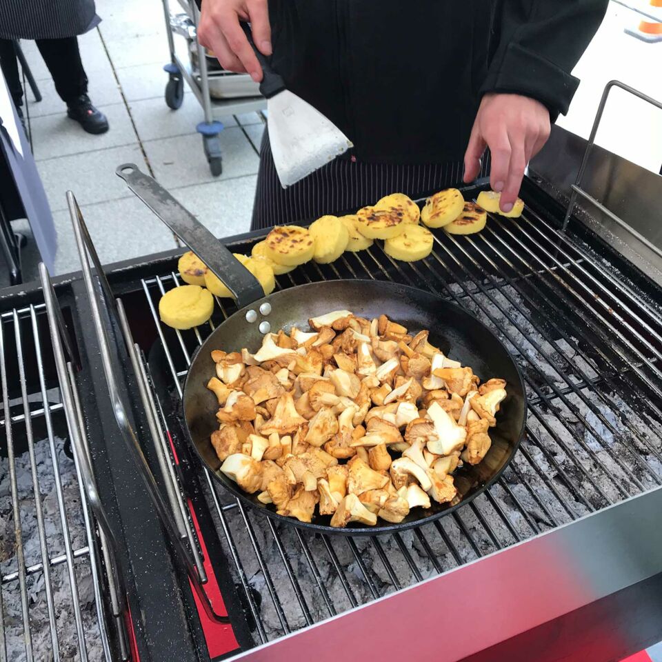 Eine Eisenguss-Pfanne auf den Grill stellen, damit sie Temperatur bekommt. Pilze in der Pfanne mit etwas Olivenöl anziehen. Während die Pilze in der Pfanne sind, kannst du parallel die Polenta auf den Grill legen und von beiden Seiten bräunen.