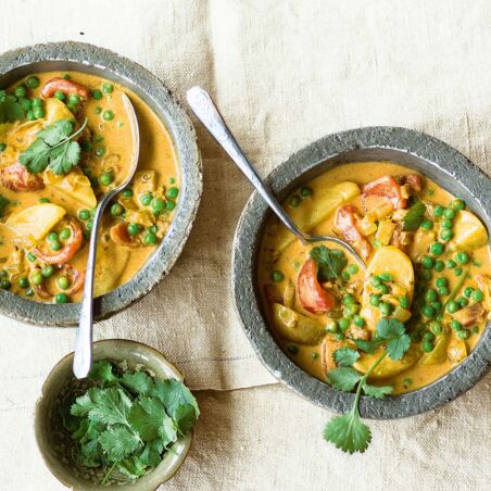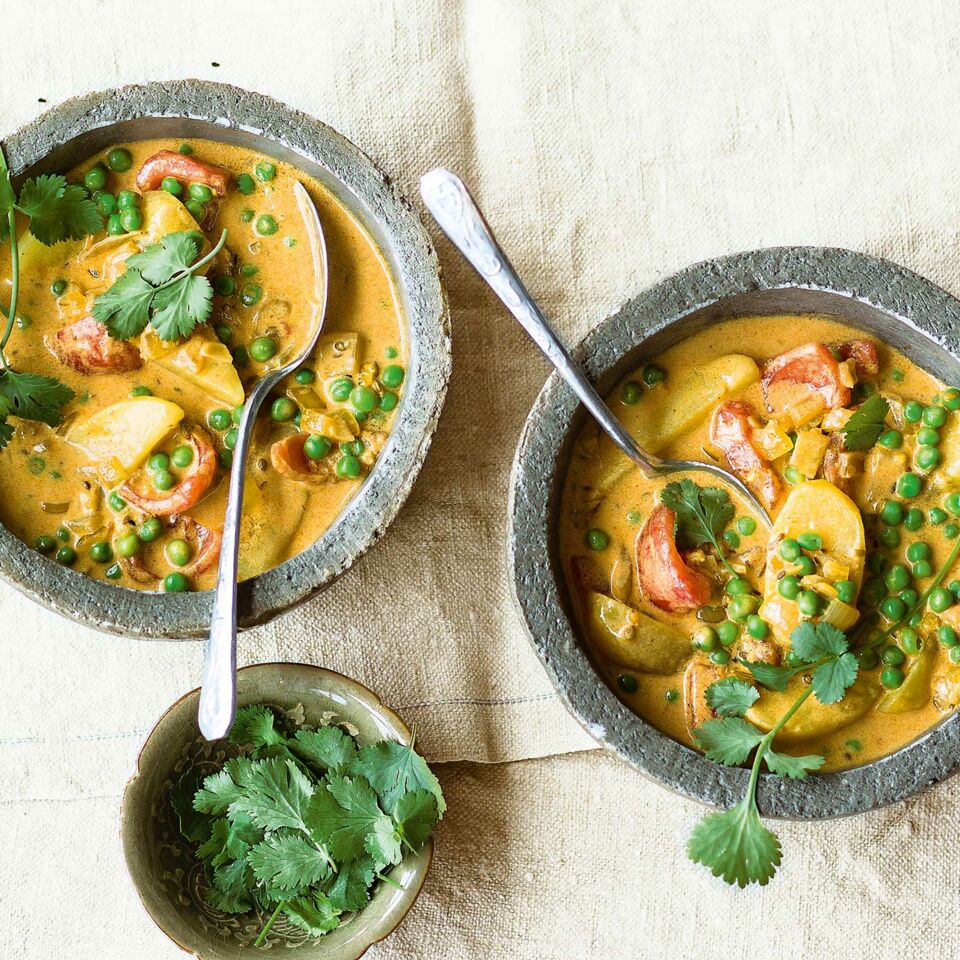 Erbseneintopf im neuen Gewand: Hier landen nicht nur frisch gepalte Erbsen, sondern auch Tomaten, Kokosmilch und jede Menge indische Gewürze im Suppentopf.