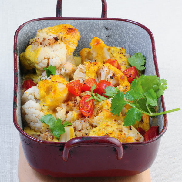 Joghurt, Mehl, Eier, Pfeffer, Kurkuma und Garam Masala gut verquirlen. Die Zwiebelmasse unterrühren und kräftig salzen. Blumenkohl und Tomaten in der Form mischen. Die Joghurtcreme darübergießen. Im heißen Ofen (Mitte, Umluft 170°) in ca. 25 Min. goldgelb garen. Den Koriander waschen, hacken und darüberstreuen.