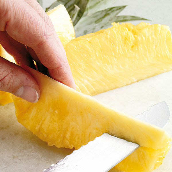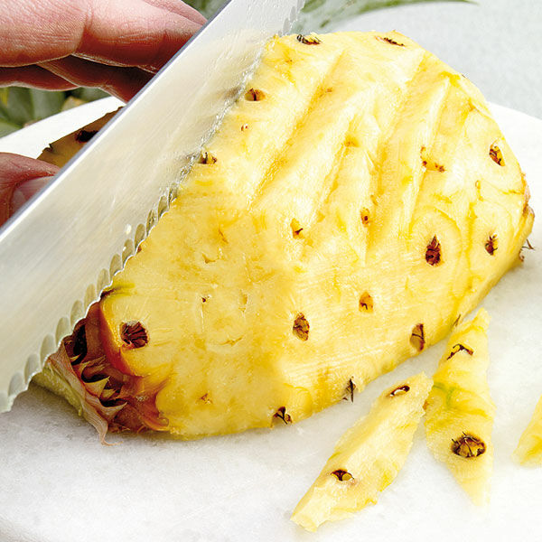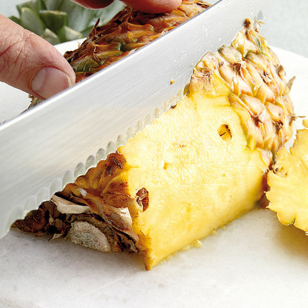 Die Ananas halbieren und schälen. Mit diagonalen Schnitten die schwarzen »Augen« entfernen. Die Ananashälften vierteln. Das Fruchtfleisch vom harten Kern schneiden und ca. 2 cm groß würfeln.