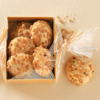 Den Nougat in 35 Würfel schneiden. Jeden Nougatwürfel in die Mitte einer Teigportion drücken und diese zu einer Kugel formen, die den Nougat umschließt. Jede Kugel zuerst im Eiweiß, dann im Haselnusskrokant wälzen. Die Kugeln auf ein mit Backpapier belegtes Blech setzen und im Ofen (Mitte, Umluft 160°) ca. 20 Min. backen.