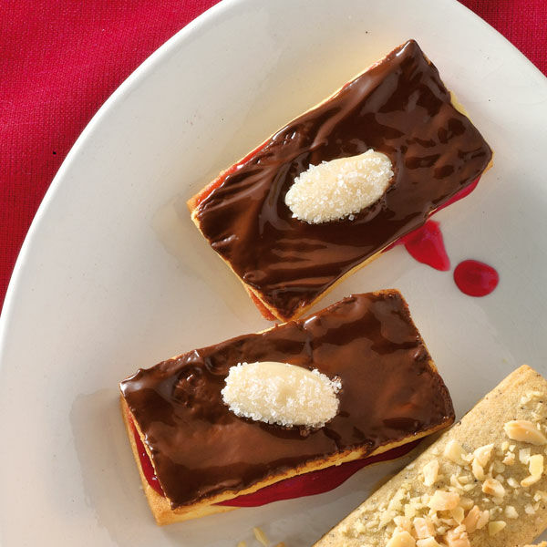 Die Zubereitung ist etwas aufwändig, aber für diese edlen Stückchen lohnt es sich: 2 Schnitten werden mit Konfitüre zusammengesetzt und mit Kuvertüre überzogen. Fein!