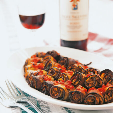 Eine feine Delikatesse aus Apulien sind die würzigen Auberginenröllchen, gefüllt mit einer Mischung aus Rosinen, Pinienkernen und Kräutern.