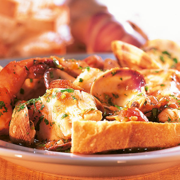 Fische in ungefähr 4 cm große Stücke schneiden. Garnelen ganz lassen. Muscheln waschen. Die, die sich beim Waschen nicht geschlossen haben, wegwerfen.