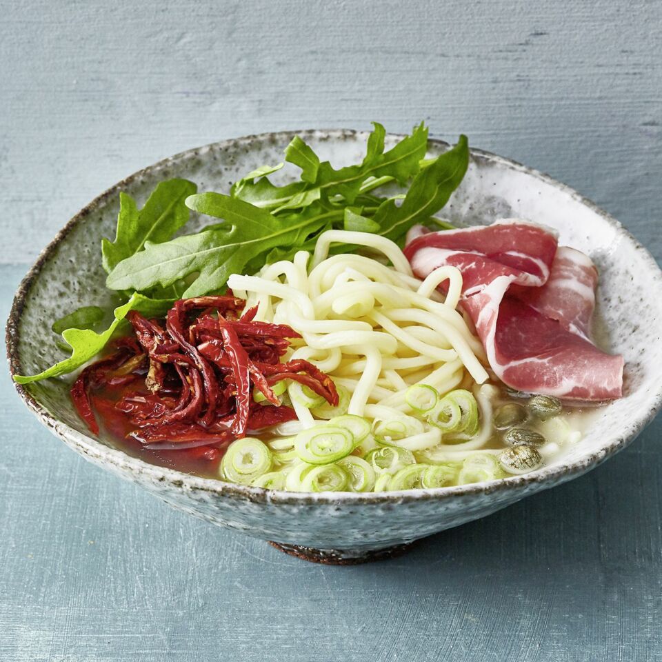 Japan meets Italien: In dieser Ramen Bowl findet ihr ganze fünf italienische Zutaten! Ob zum Mittag oder als Abendessen, diese Fusionsküche schmeckt.