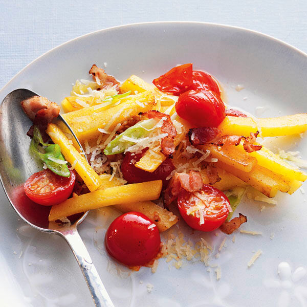 Rüben im heißen Fett unter Rühren anbraten. Mit Salz, Pfeffer und Thymian würzen. 150 ml Wasser zugießen und 20 Min. bei mittlerer Hitze zugedeckt garen. Inzwischen Frühlingszwiebeln putzen, waschen, in Stücke schneiden. Tomaten waschen, halbieren. Beides 5 Min. mitgaren, salzen, pfeffern. Gemüse mit Käse und Speck bestreut anrichten.