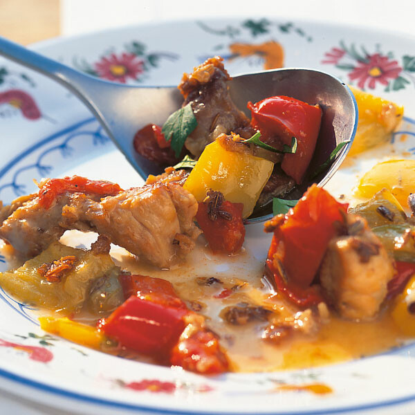 Den Speck in einem Topf bei mittlerer Hitze ausbraten, bis er flüssig ist. Fleischstücke in zwei Portionen darin anbraten, dann den Knoblauch dazugeben und kurz mitbraten. Mit dem Wein ablöschen, mit Salz würzen und zugedeckt bei schwacher Hitze insgesamt etwa 45 Min. garen. Dann die Paprikawürfel dazugeben. Alles weitere 30-45 Min. garen, bis das Fleisch schön weich ist. Dabei gelegentlich durchrühren.