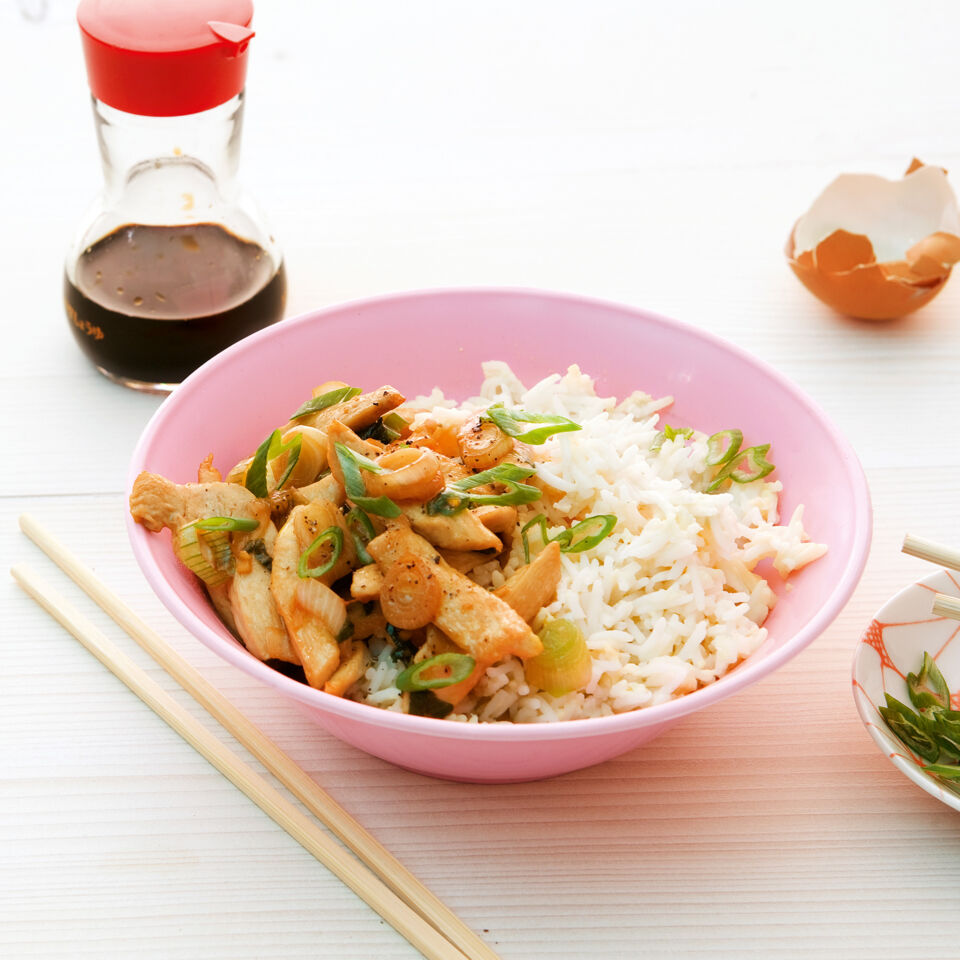 Eierreis mit einer Gabel durchrühren, mit Salz und Pfeffer abschmecken und in zwei Schälchen füllen. Gebratenes Hähnchen mit Salz, Pfeffer und Zucker abschmecken und auf dem Reis verteilen. Mit dem beiseitegelegten Frühlingszwiebelgrün bestreuen und servieren.