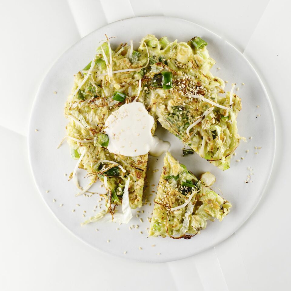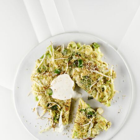 Der traditionelle Name für dieser herzhaften Kohl-Pfannkuchen aus Japan lautet Okonomiyaki und bedeutet so viel wie "nach eigener Vorliebe gebraten".
