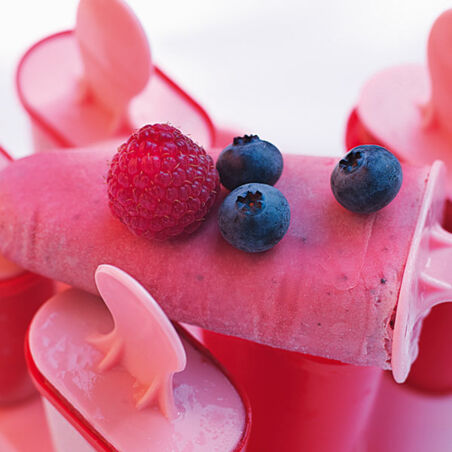 Eis am Stiel ist eine Variante, dieses fruchtige Joghurteis zu servieren. Das weiche Eis aus der Eismaschine einfach in Eisförmchen füllen und durchfrieren lassen.