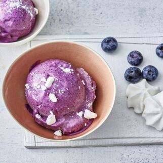 Der Eisbecher schmeckt auch mit kleinen Mangostücken und Pistazienkernen (geröstet und gesalzen) statt mit Heidelbeeren und Salzbrezeln.