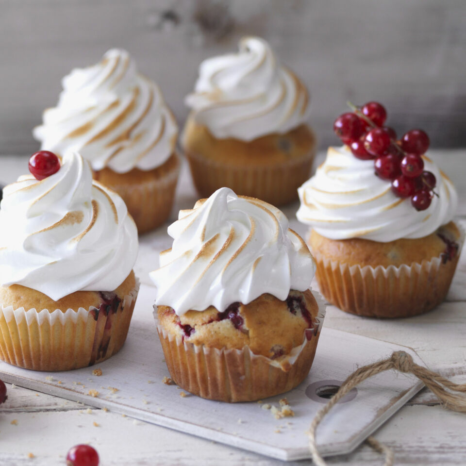 Die Papierförmchen in die Mulden setzen. Den Teig einfüllen. Im Ofen (Mitte) ca. 20 Min. backen. Für das Topping Eiweiße mit übrigem Zucker und Ingwer steif schlagen und in einen Spritzbeutel mit Sterntülle füllen. Die Cakes damit garnieren und weitere 10 Min. backen, bis die Baisermasse leicht gebräunt ist. Herausnehmen, kurz abkühlen lassen, dann die Cakes herauslösen und auskühlen lassen. Mit den übrigen Beerenrispen dekorieren.