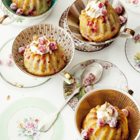 Für die Deko die restlichen Johannisbeeren in Zucker wälzen. Die Sahne steif schlagen. In einen Spritzbeutel mit Sterntülle füllen und auf die Guglhupfe spritzen. Mit den Beeren garnieren und nach Belieben noch Haferflocken über die Gugl streuen.