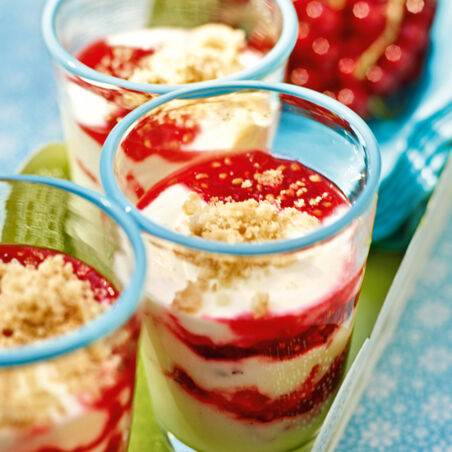 Die Sahne steif schlagen und mit dem Joghurt verrühren. Joghurtsahne und zerdrückte Johannisbeeren in Gläser schichten, dabei mit der Gabel ganz leicht marmorieren. Die Kekse zerkrümeln und auf den »Johannisbeernarren« verteilen, mit den beiseitegelegten Beeren garnieren.