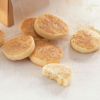 Den Backofen auf 180° (Umluft 160°) vorheizen, Backblech mit Backpapier auslegen. Rohrzucker mit Zimtpulver vermischen. Die Teigrolle mit dem Messer in ca. 5 mm dicke Scheiben schneiden. Die Teigkreise nach und nach aufs Blech legen, mit Eiweiß dünn bespinseln, mit Zimtzucker bestreuen und im Ofen (Mitte) in 8-10 Min. goldgelb backen. Auf einem Kuchengitter auskühlen lassen.