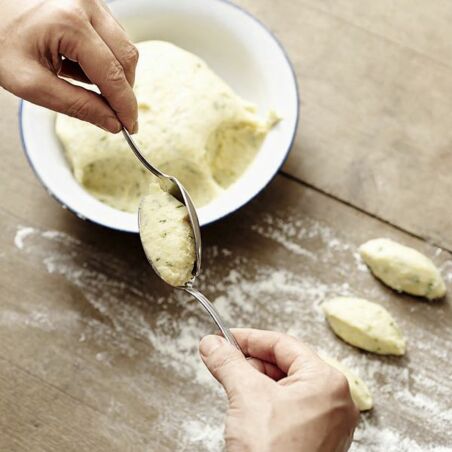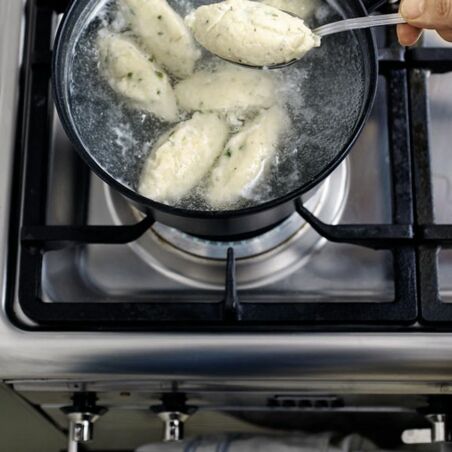 Für die Nocken Basilikum waschen und trocken schütteln, Blätter abzupfen und in feine Streifen schneiden. Kartoffeln pellen, durchpressen und mit Grieß, Mehl, Eiern, Muskatnuss und Basilikum verkneten. Jeweils etwas Kartoffelmasse abstechen und mit zwei angefeuchteten Esslöffeln zu glatten Nocken formen, auf ein bemehltes Brett legen.