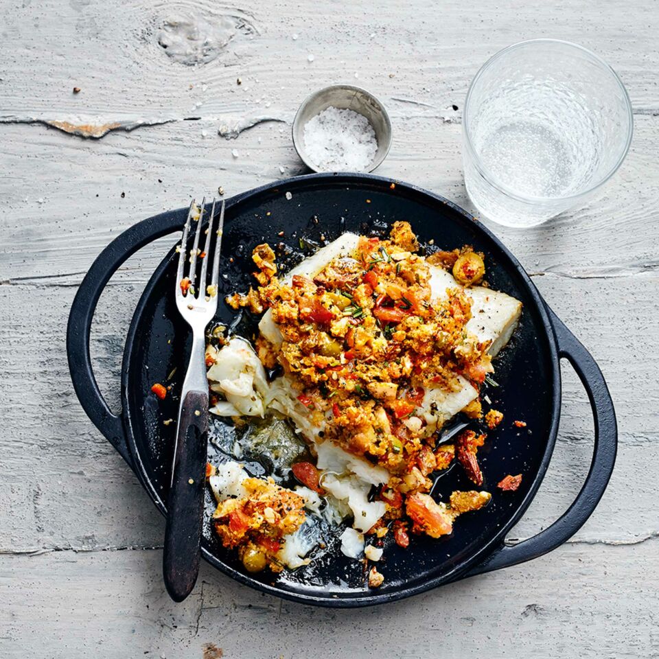 Den Backofen auf 180° (Umluft 160°) vorheizen. Den Kabeljau waschen und trocken tupfen. Die Tomate kreuzförmig einritzen, mit heißem Wasser überbrühen, häuten und ohne Stielansatz ganz klein würfeln. Knoblauch schälen, Rosmarin waschen, die Nadeln abstreifen und beides fein hacken. Oliven klein schneiden.