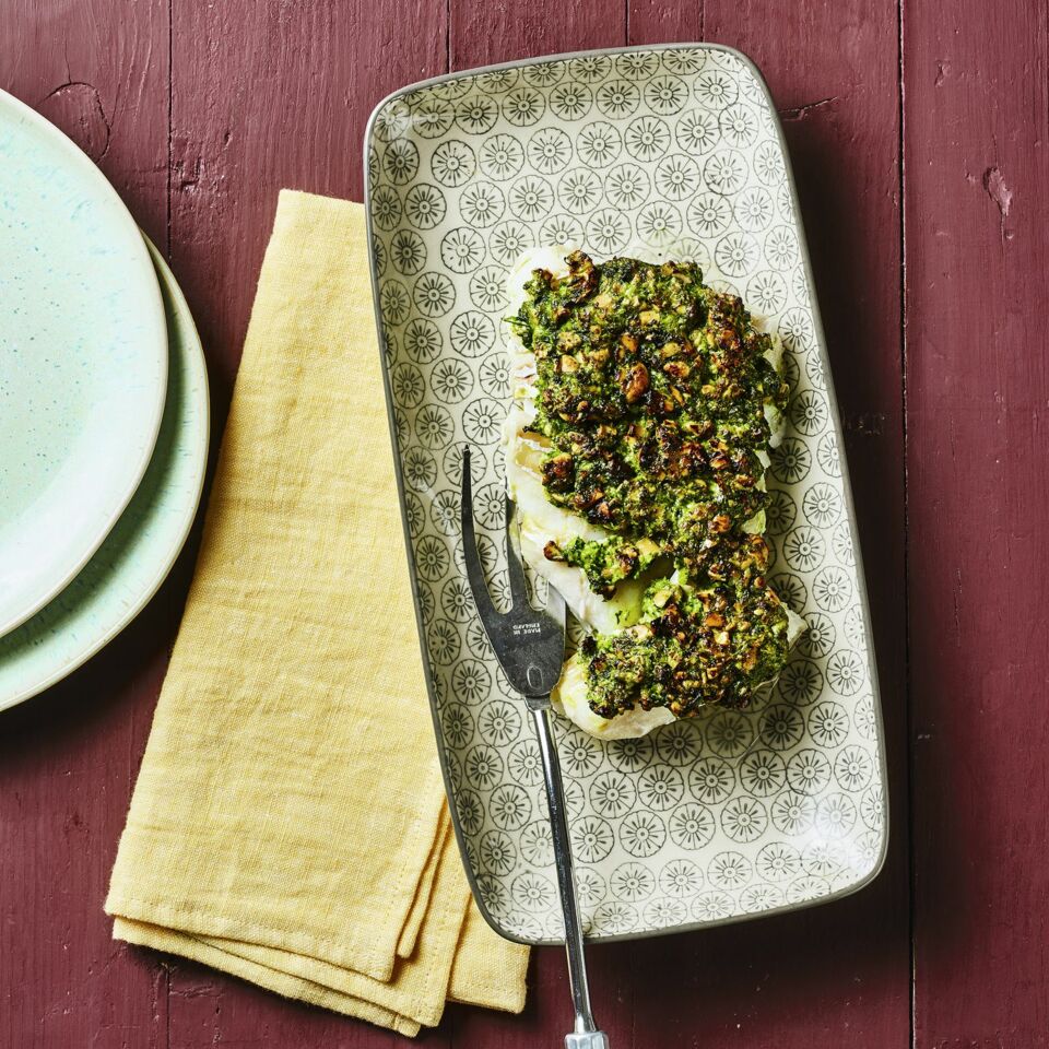 Frischer Fisch auf den Tisch: Besonders lecker wird er mit einem Mantel aus Cashew-Pesto. Blitzschnell im Ofen gegrillt und schon servierfertig.