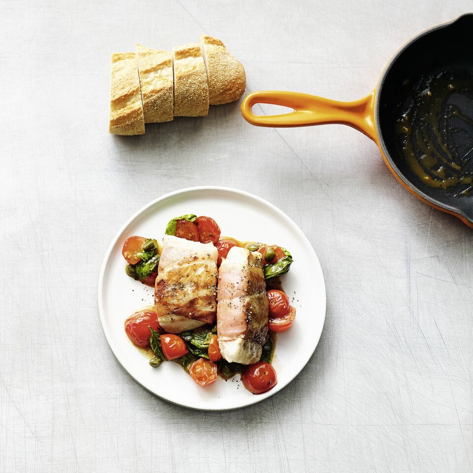 Die Fischpäckchen auf Tellern anrichten. Den übrigen Zitronensaft (1 EL), die Essiglake (von den Kapern) und das Basilikum zu den Tomaten geben und alles kurz durchschwenken. Mit Salz und Pfeffer würzen und neben dem Fisch auf den Tellern anrichten. Die Brötchenscheiben dazu servieren.