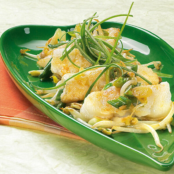 Sprossen waschen. Zwiebeln in feine Streifen schneiden. Ingwer schälen und klein würfeln. Öl im heißen Wok erhitzen. Sprossen und Zwiebeln 1 Min. pfannenrühren, herausnehmen. Ingwer und Fisch unter Wenden 2-3 Min. braten. Gemüse und Brühe untermischen. Mit Sojasauce, Salz und Pfeffer würzen.
