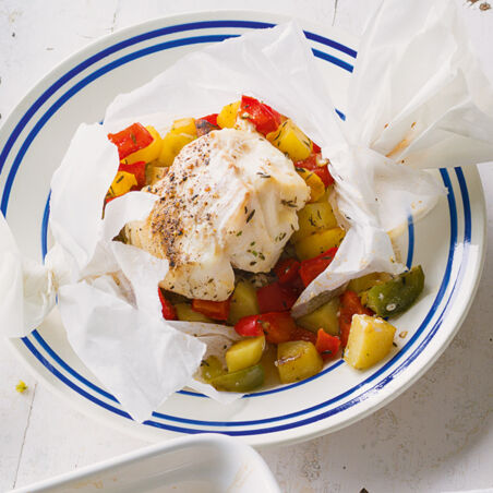 Erst auspacken und dann genießen: Kartoffeln, Paprika und Fischfilet werden gemeinsam im Päckchen gegart Himmlisch gut!
