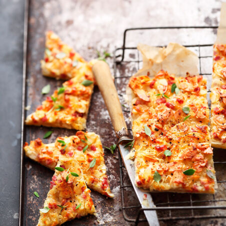 Den Teig zwischen zwei Bögen Backpapier auf Blechgröße ausrollen, aufs Blech legen und das obere Papier abziehen. Die Käse-Nuss-Mischung auf dem Teig verteilen, leicht andrücken. Im Ofen (Mitte) in ca. 30 Min. goldbraun backen.