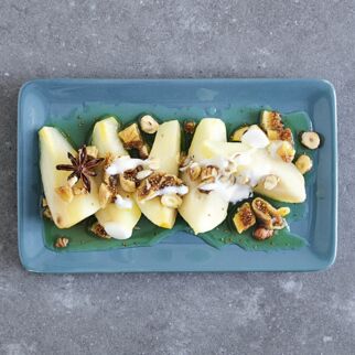 Die Butter in einer kleinen Pfanne schmelzen lassen. Birnenspalten und -würfelchen darin unter Wenden 1 Min. braten, Zitronensaft hinzufügen. Vom Herd nehmen und abkühlen lassen.