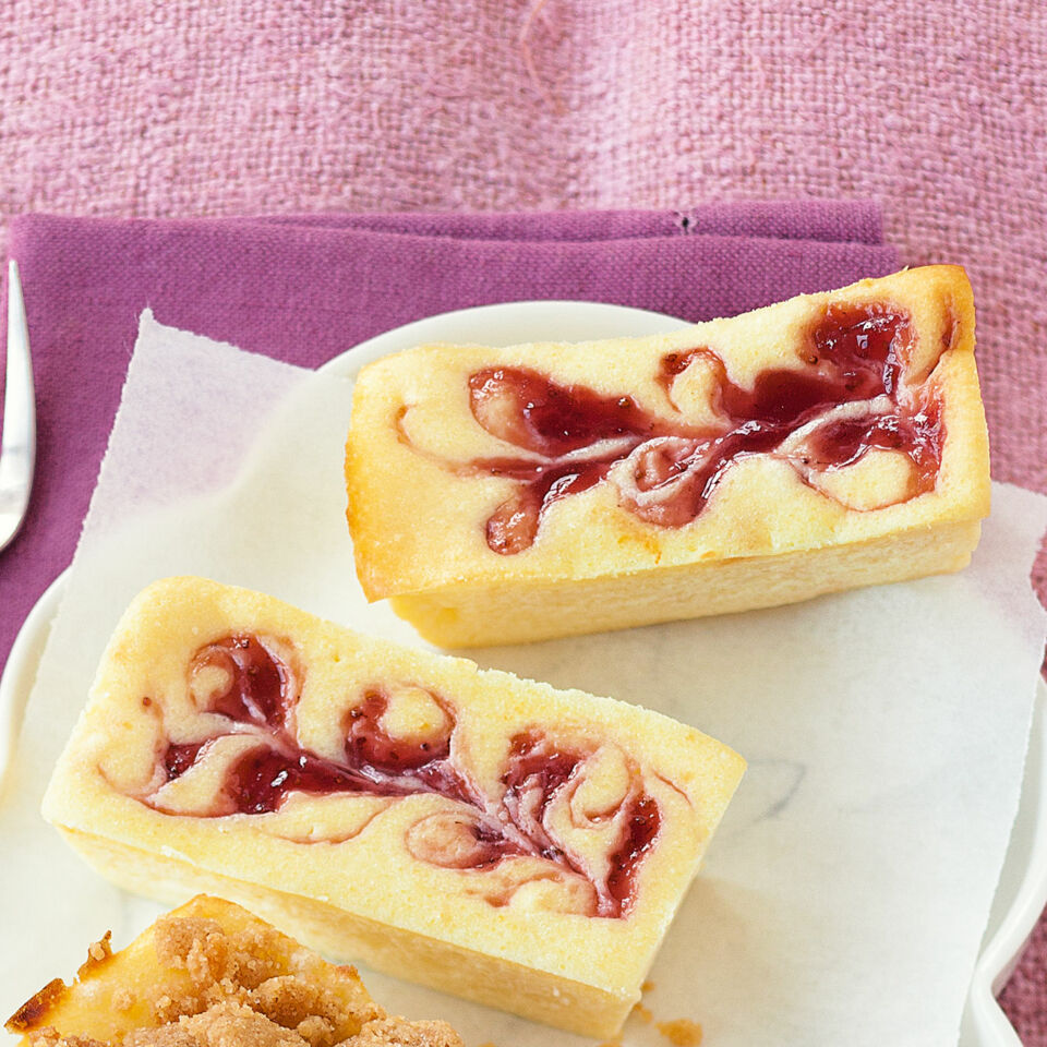 Den Backofen auf 180° (Umluft 160°) vorheizen. Die Butter mit dem Zucker und dem Grieß in einer Rührschüssel cremig rühren. Zitronenschale und -saft mit dem Quark und den Eiern unterrühren. Die Speisestärke darüberstäuben und unterheben. Die Konfitüre in einem kleinen Topf erwärmen, bis sie schön geschmeidig wird.