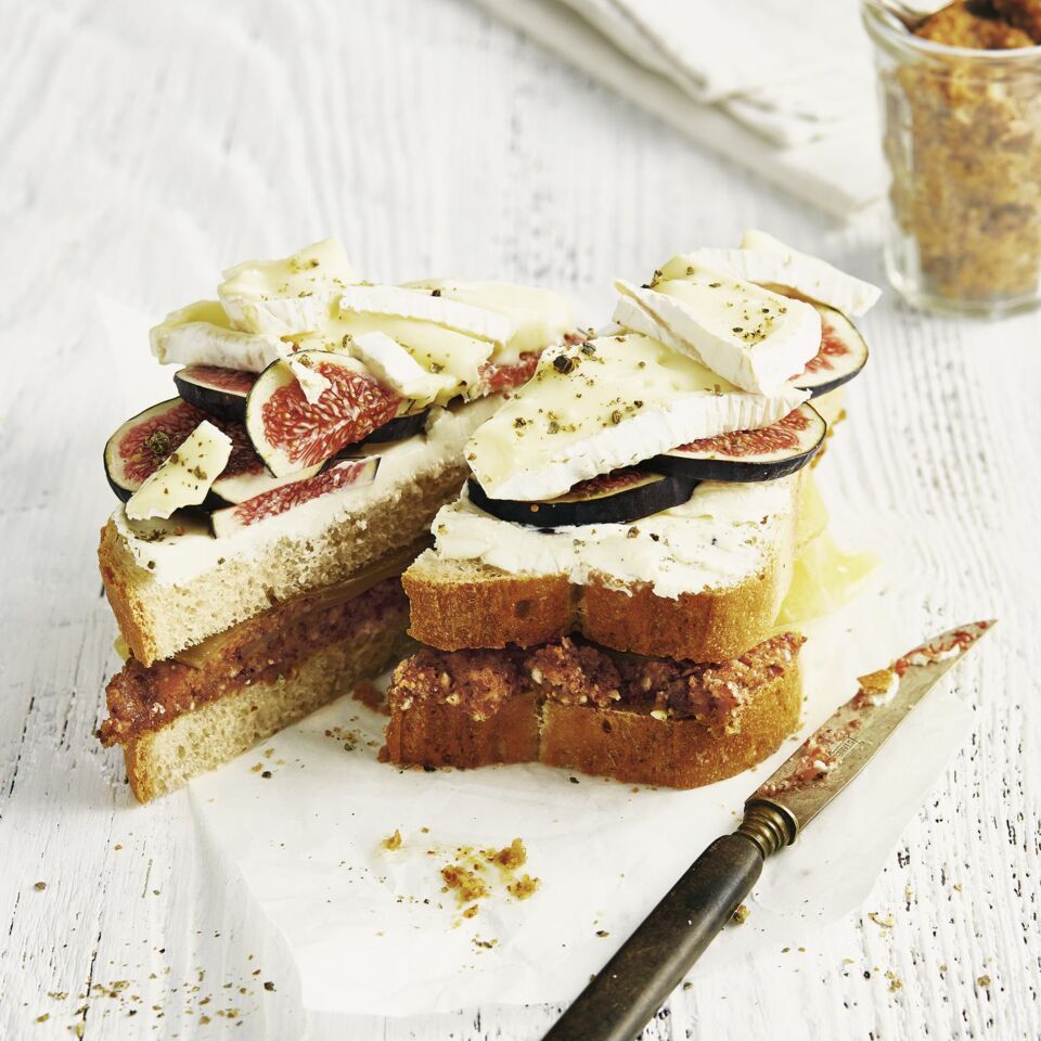 Den Feigensenf auf 2 Brotscheiben streichen. Den Bergkäse darauf verteilen und mit dem Flambierbrenner schmelzen. Die restlichen Brote auf den geschmolzenen Käse legen und mit dem Frischkäse bestreichen. Die Feigen- und Camembertscheiben daraufschichten und mit grünem Pfeffer bestreuen. Die Stullen warm servieren.