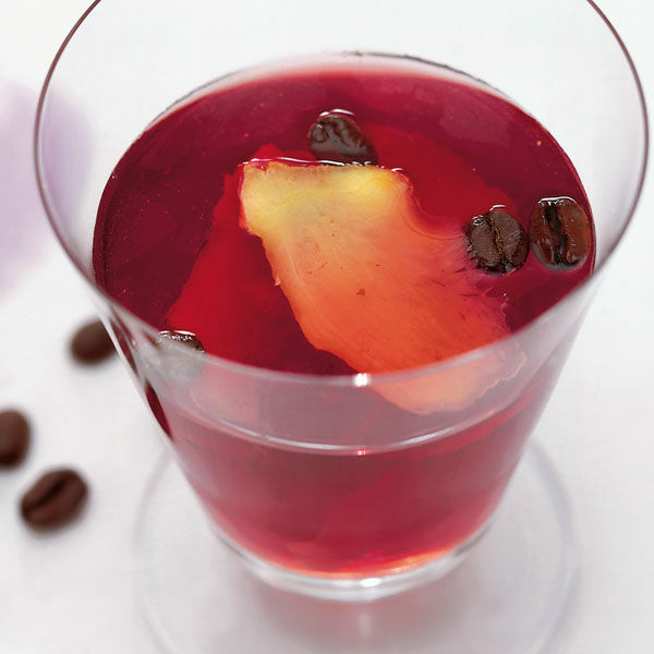 Den Würzansatz durch ein Sieb ins Bowlengefäß gießen. Mit Rotwein und Ginger Ale aufgießen. Die Bowle mit Espressobohnen und Ingwerscheiben dekorieren und sofort servieren.